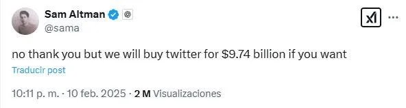Em fevereiro de 2025, Musk e um grupo de investidores fizeram uma oferta não solicitada de US$ 97,4 bilhões para adquirir a OpenAI.
