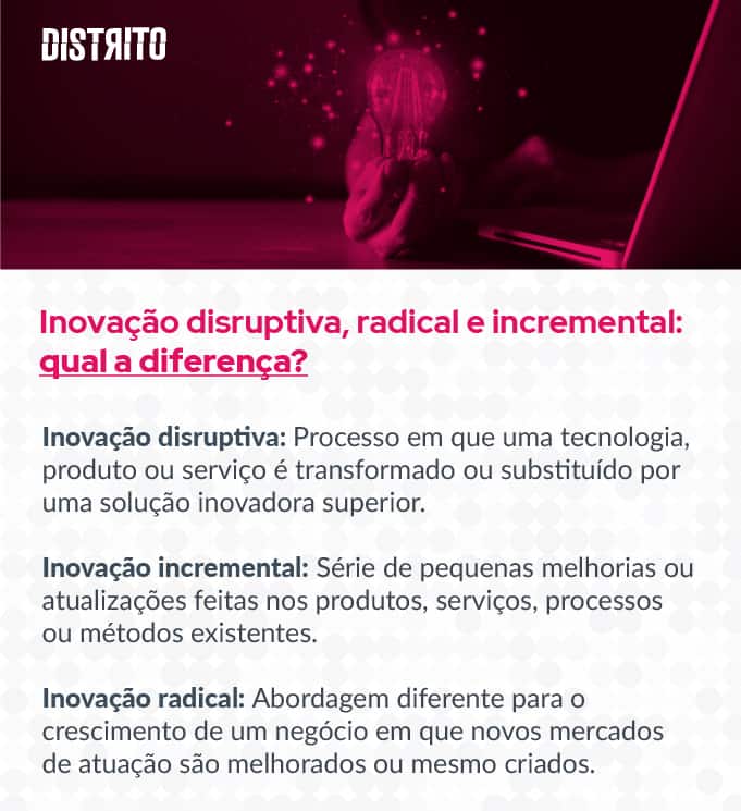 Diferente da inovação incremental, que tem como objetivo realizar melhorias e atualizações em produtos já existentes, a inovação radical é focada em construir uma solução inédita do zero visando explorar novos mercados e expandir sua atuação.