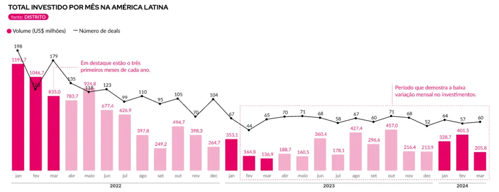 A título de comparação, o ano inteiro de 2023 registrou US$ 8,9 milhões em investimentos nessa modalidade. Ou seja, só nesse primeiro trimestre, as startups latino-americanas levantaram 43% do volume total do ano passado.